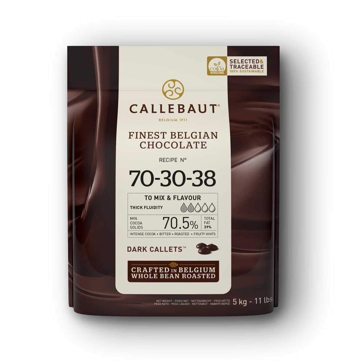 Recipe N° 70-30-38 is a dark chocolate loved by chefs and chocolatiers around the globe. It has an intense, yet balanced chocolate taste dominated by a solid body of roasted cocoa, powerful bitter notes and fresh, fruity hints. This makes it the ideal chocolate for boosting rich chocolate flavour in your creations.