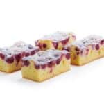A fluffy dough base with beautifully juicy cherries. Finished off with chopped hazelnuts for a great taste and beautiful look. This cake is lightly dusted over.
