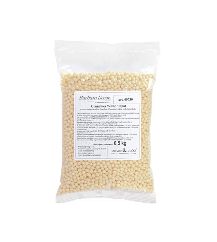 White chocolate coated balls with crunchy core based on rice flour. The chocolate coating protects the inside from softening, thanks to which the balls remain crunchy.
