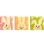 The Funny Bunny is a set of three 30 mm square decorations made of high-quality white chocolate with bunny heads printed against one of three background colours: green, pink and yellow. The practical size of the decoration and its pastel colours are perfect for cheerful Easter cakes and desserts.